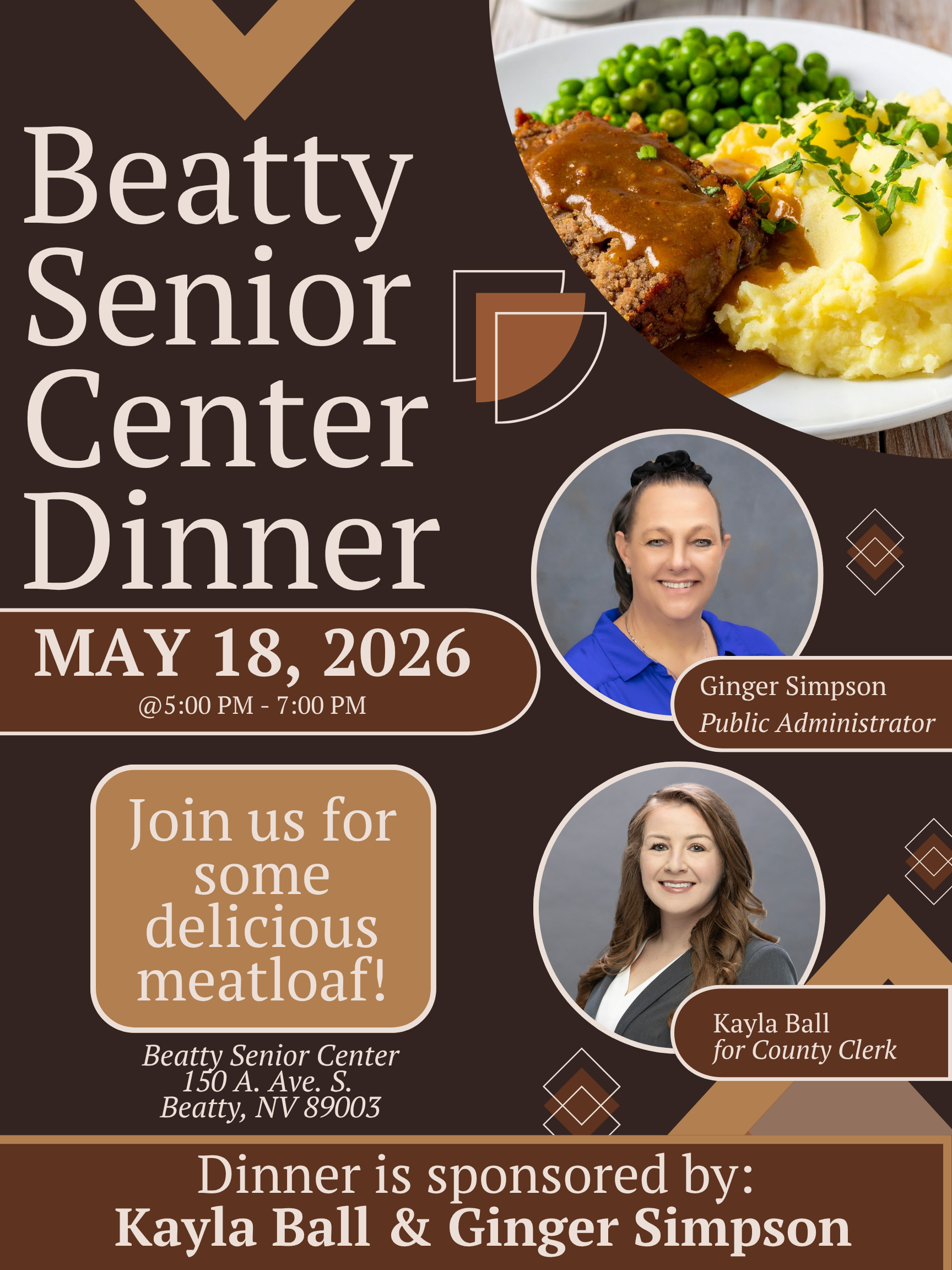 Back to All Events Beatty Senior Center Dinner Monday, May 18, 2026 5:00 PM 7:00 PM Beatty Senior Center 150 A Avenue South Beatty, NV, 89003 United States (map) Google Calendar ICS
