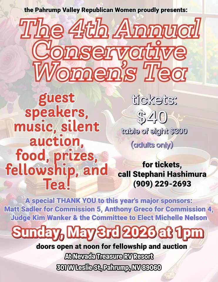 The 4th Annual Conservative Women's Tea Sunday, May 3, 2026 1:00 PM 4:00 PM Nevada Tresure RV Resort 301 West Leslie Street Pahrump, NV, 89060 United States (map) Google Calendar ICS